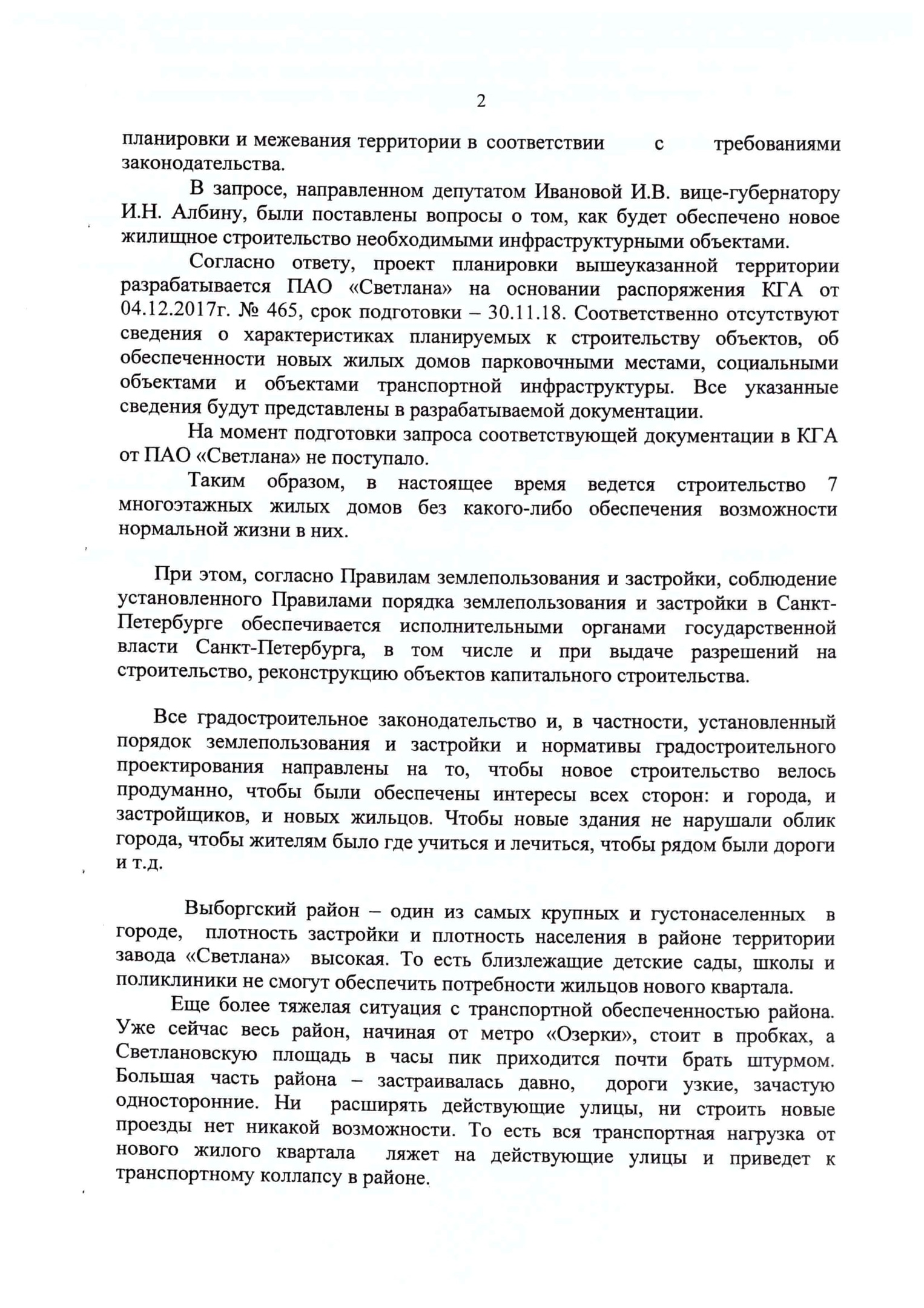 Согласно ответу, проект планировки вышеуказанной территории разрабатывается ПАО «Светлана» на основании распоряжения КГА от 04.12.2017г. № 465, срок подготовки – 30.11.18. Соответственно отсутствуют сведения о характеристиках планируемых к строительству объектов, об обеспеченности новых жилых домов парковочными местами, социальными объектами и объектами транспортной инфраструктуры. Все указанные сведения будут представлены в разрабатываемой документации.