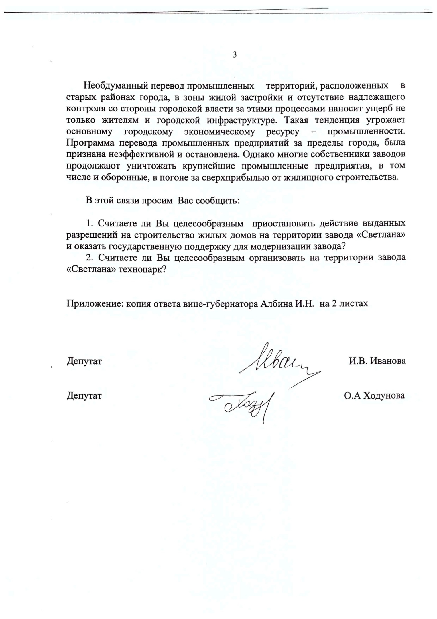 1. Считает ли он целесообразным приостановить действие выданных разрешений на строительство жилых домов на территории завода «Светлана» и оказать государственную поддержку для модернизации завода?