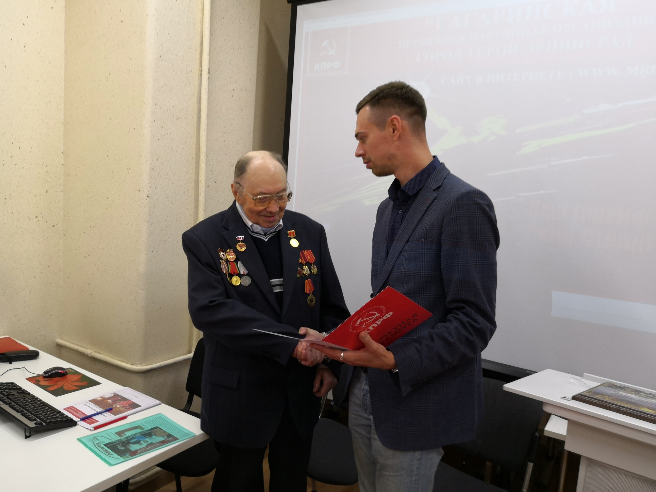 По традиции партийное собрание началось с исполнения гимна СССР и утверждения повестки дня. Перед её обсуждением был вручен партийный билет молодому коммунисту Артёму Бахвалову, который заверил присутствующих в своей решимости отстаивать идеи социальной справедливости, бороться за реализацию положений Программы КПРФ. Он отметил, что сейчас в обществе на фоне стабильно ухудшающихся внутренней социально-экономической и внешней военно-политической ситуаций очень заметны настроения сожаления о том, что мы потеряли СССР и понимания того, что за социализмом будущее.