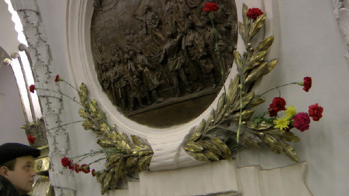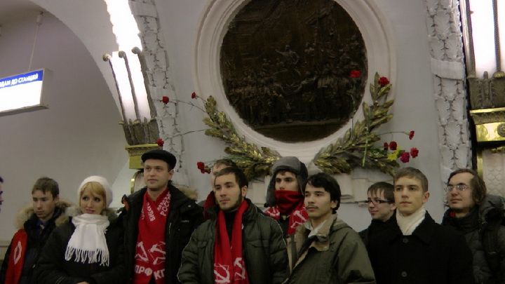 В 131-вую годовщину со дня рождения Великого вождя Советского народа Иосифа Виссарионовича Сталина,комсомольцы принесли цветы к одному из чудом сохранившихся изображений этого выдающегося человека.У барельефа на станции метро площадь Восстания.
