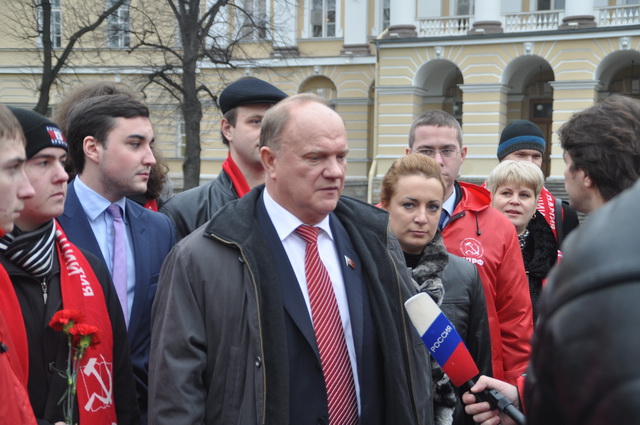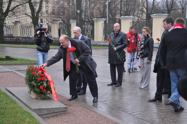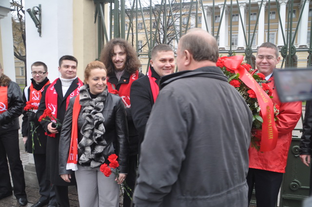 После встречи с редакторами ведущих региональных средств массовой информации лидер партии отправился к Смольному. У дворца, за которым закрепилась слава штаба революции, лидер партии вместе с ленинградскими комсомольцами возложил цветы к памятнику вождю мирового пролетариата.